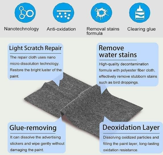 - 【Easy Use】1.Clean up and dry the surface of dirty area before using the magic cloth;2.Take a small area for testing first to test whether it is compatible with the car color and paint;3.Wear the gloves,Wipe the scratches and dirt with the smart towel;4.Clean up the surface by other cloth,and Put it back, keep sealed for reusage.