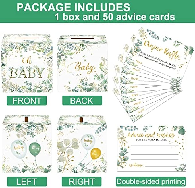• Delicate Design: there are baby theme words printed on the surface of the box, 2 sides of the box feature green balloons, and all the backgrounds have greenery and gold leaves; The top of the box opens a nice slot for friends and family to drop the cards into it easily