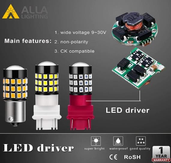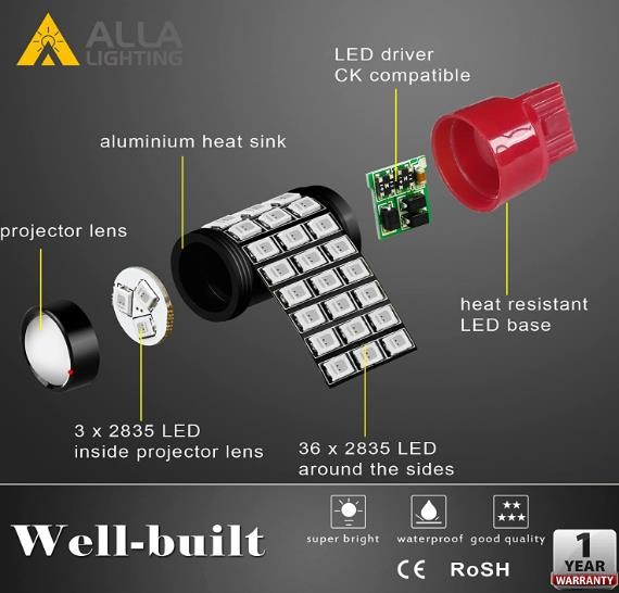 Alla Lighting 2835 39-SMD T25 wedge 3156 3157 LED bulb makes your car more easily noticed while stopping by switching to braking mode,and also makes your car look much more luxury than stock lamp, more attractive.