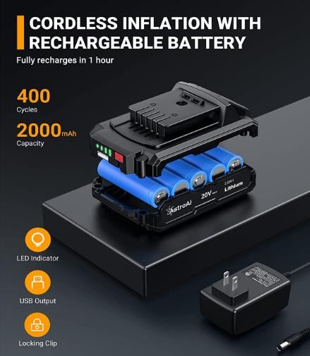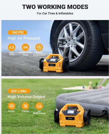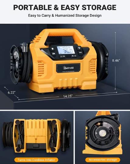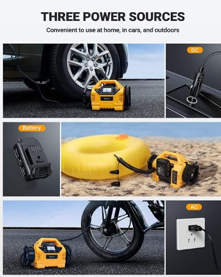 Lightweight, easy to use compressor. Plugs in an AC outlet, has its own individual battery and battery charger and it plugs into your DC power in your vehicle! It has a powerful light. Has long cords for easy convenience.