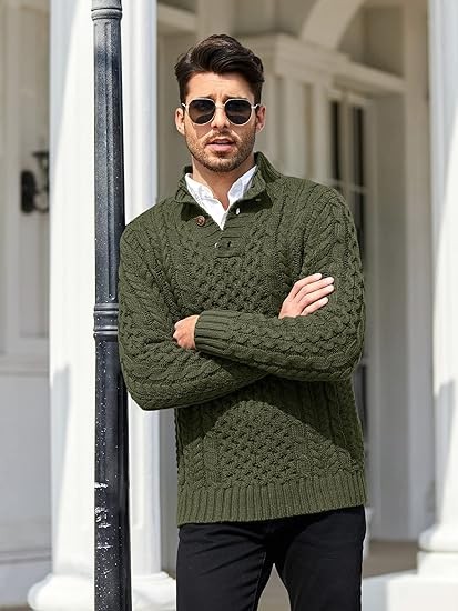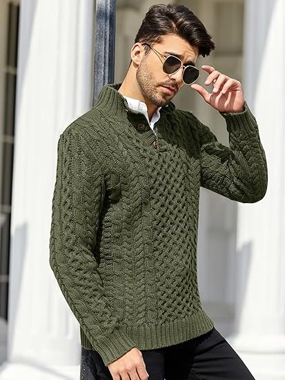 • Feature:Fashion pullover sweater for men features stand collar, relaxed fit, cable stitch, ribbed collar and cuffs, long sleeve, solid color, chunky warm, cable twist knit, basic simple design