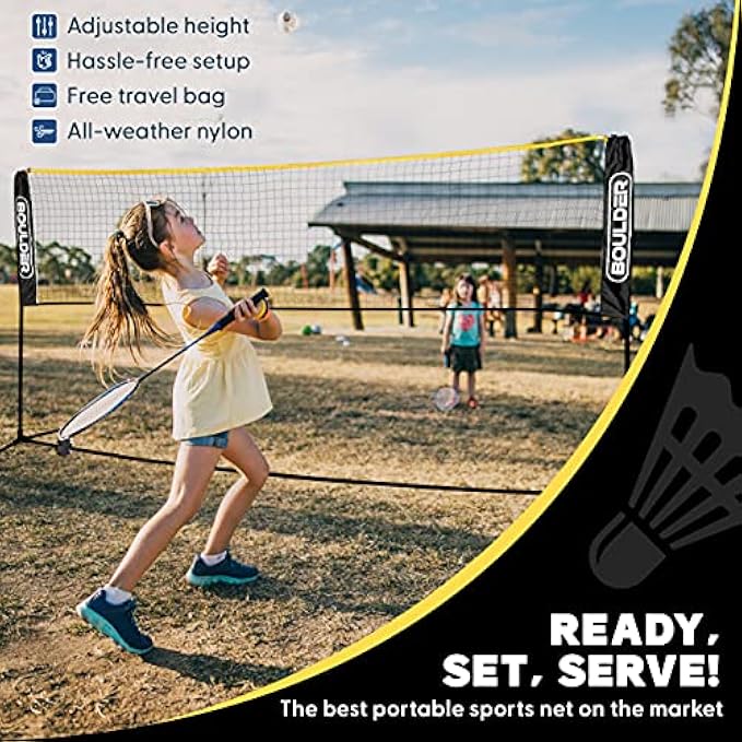 Boulder Badminton Pickleball Net - Height Adjustable Portable Net for Junior Tennis, Kids Volleyball & Soccer, and Backyard Games - Easy Setup Nylon Sports Net with Poles 10 ft/14ft/17ft Wide
