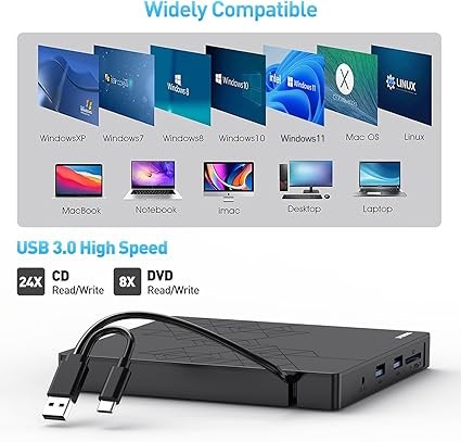 • 【WIDE COMPATIBILITY】- The external dvd burner for laptop is compatible with Windows XP /2003 /Win 11/Win 10 / Win 8 / Win 7 / Vista / Linux / Mac OS X systems(Windows 11 requires media player and network), compatible with laptops, computers, notebooks, and desktops. In addition, the cd to mp3 converter also supports reading and writing of CD±R/RW, CD-ROM, DVD±R/RW, DVD-RAM, VCD, and SVCD.