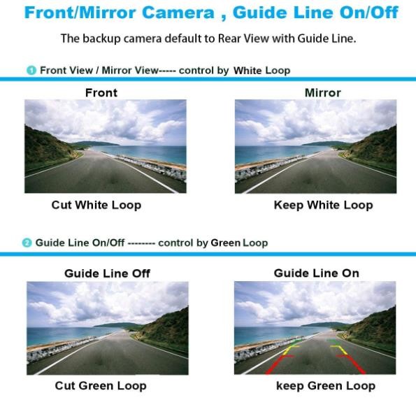 Front/Rear Camera & Guide Line On/Off: Cut the WHITE cable can be Rear View Camera; Cut the GREEN cable show the Guide Line. You can choose install in front or Back to your car. IMPORTANT: Please Restart your radio again after you cut wire loops, then the image should be correct.