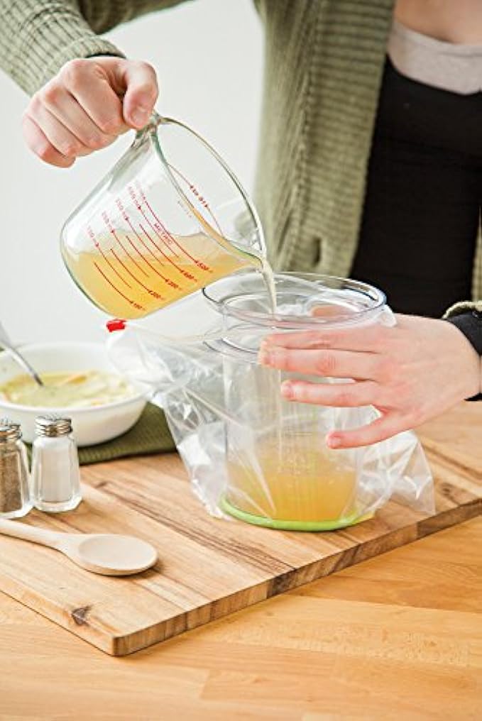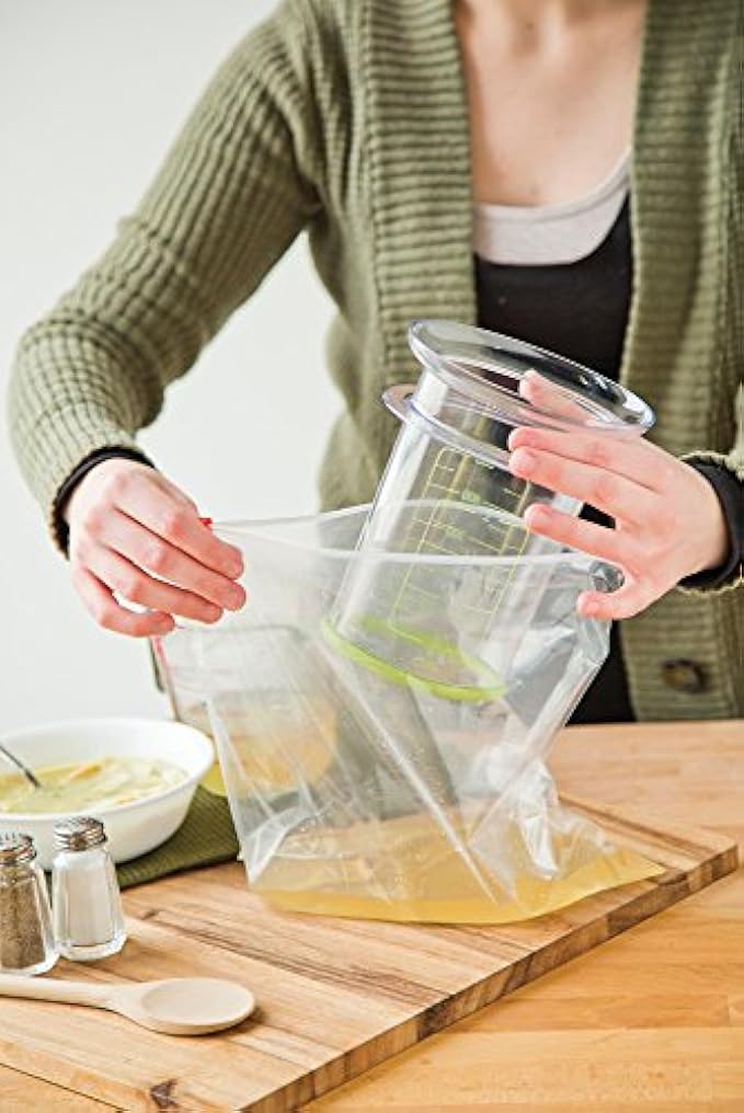 Holds storage bags open so you can fill with no mess, measure marks show you how to accurately control content amount