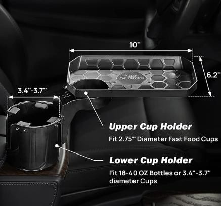 As a delivery driver and someone who is in the car all the time, I love the little tray with cup holder while the main holder know holds my large bottles and cups.