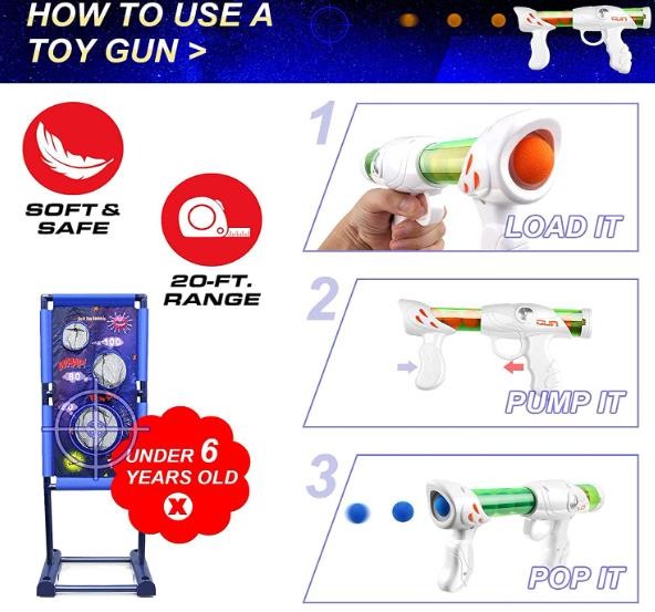 Safe and simple: all bullets are made of foam balls with a diameter of 1 inch. The shooting is done by air pressure. The impact is very small and will not cause any harm to the human body. It is very suitable for children to play. You only need to put the bullets into the toy gun to start the game