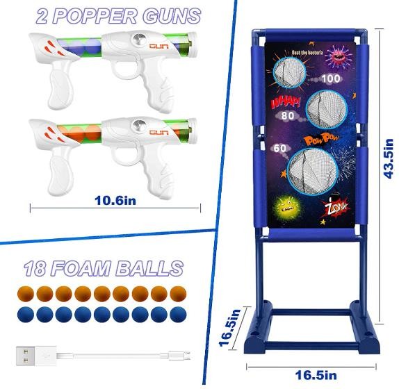 The package contains: 2 * Toy Gun, 1 * Stand Moving Target, 9 * Blue foam bullet, 9 * Orange foam bullet, 1 * Manual, 1 * USB cable, please check the package in time after receiving the goods, if there is any Dissatisfication, please contact us immediately, we will handle it properly for you