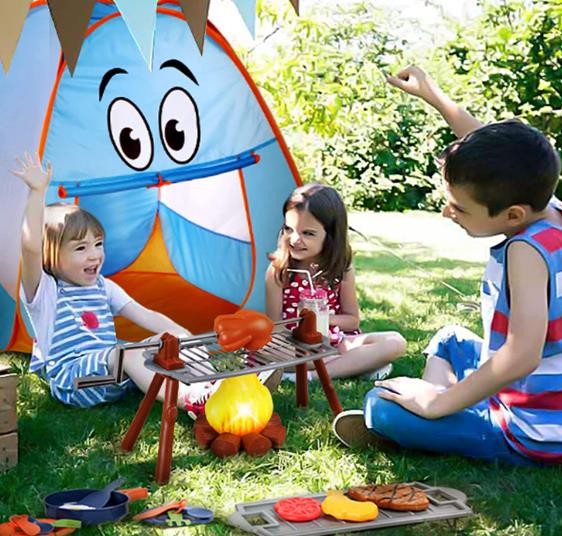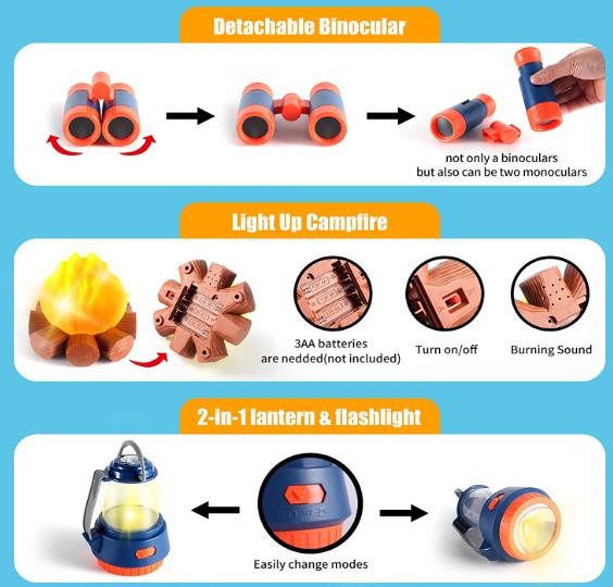 【Multiple Scenes Camping Play Set Using】Camping set for kids allows kids to multiple roles-play. Kids could sit in the camping tent watch the toy campfire or sit near the grill so they can pretend to cook food. Or use the telescope for more adventure explore.