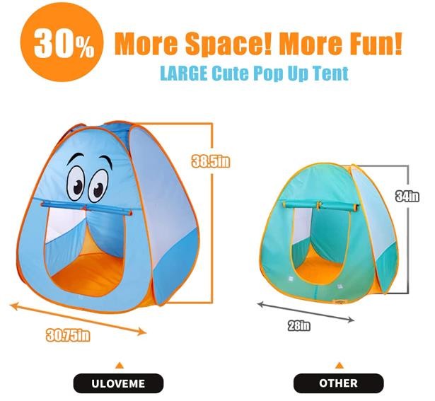 【Extra-Large CUTE Tent】Collapsible pop up children's' play tent, easy to set it up in seconds. Extra-Large design provide more space for children playing or reading together in it which comfortably fits 2-3 kids for indoor and outdoor activities. Cute eye-catching design make it unique.