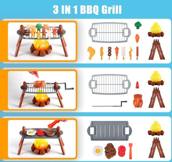 【Pretend Grill Anywhere】Simulate the barbecue activities, whatever indoors or outdoors little boys and girls can experience a funny barbecue, satisfying their desire to grill like parents. They also can feel the burning bonfire(need 3AA batteries, not including), listen the sounds like burning wood and pretend taste the delicious food.