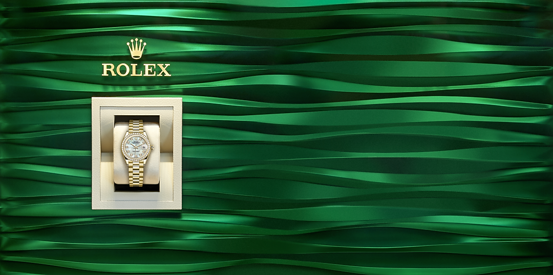 The light reflections on the case sides and lugs highlight the elegant profile of the 28 mm Oyster case, which is fitted with a diamond-set bezel. Rolex's classic feminine watch, the Lady-Datejust is in the lineage of the Datejust, the emblematic model that has been a byword for style and accurate timekeeping.
