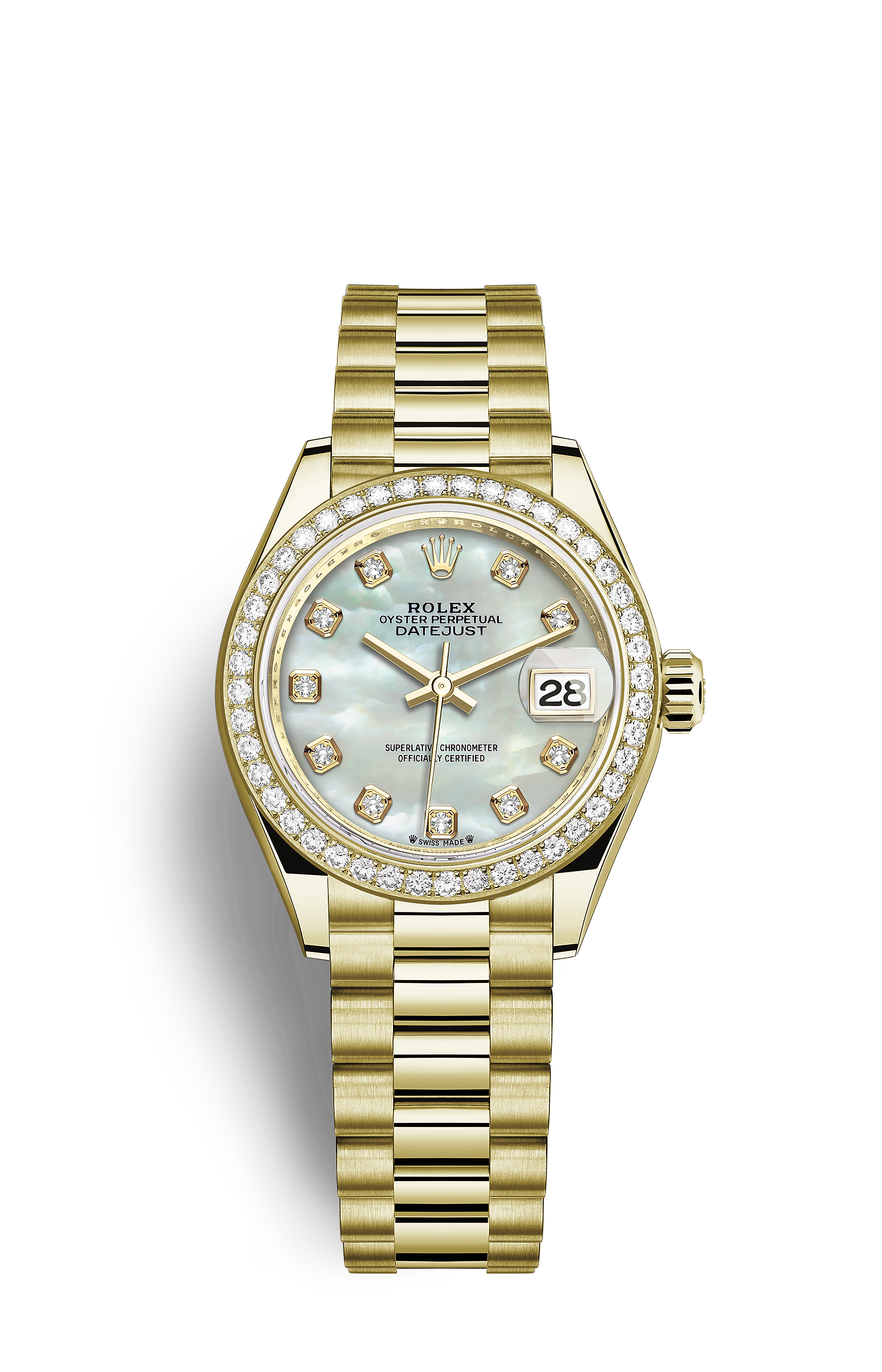 THIS OYSTER PERPETUAL LADY-DATEJUST IN 18 CT YELLOW GOLD FEATURES A WHITE MOTHER-OF-PEARL, DIAMOND-SET DIAL AND A PRESIDENT BRACELET.
