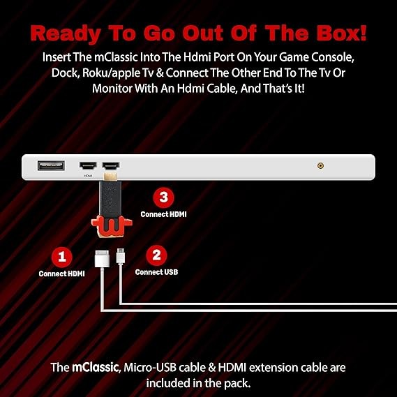• Video Game Accessory: Insert the mClassic into the HDMI port on your game console, dock, Roku/Apple TV & connect the other end to the TV or monitor with an HDMI cable, that’s it! The mClassic, Micro-USB cable & HDMI extension cable included in the pack.