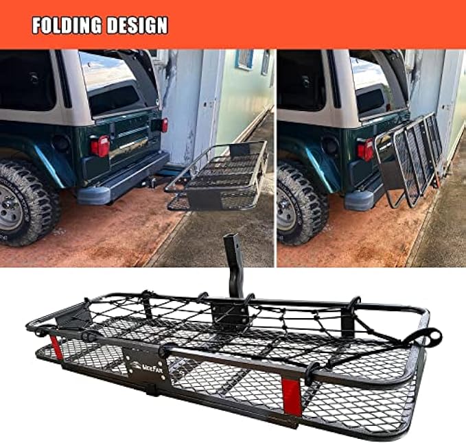 MeeFar Folding Hitch Mount Cargo Carrier Basket 60" X 20" X 6"+Waterproof Cargo Bag 16 Cubic Feet(58" 19" 24"),Hauling Weight Capacity of 500 Lbs and A Folding Arm.with Hitch Stabilizer,Net and Straps