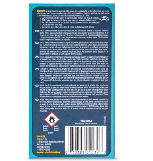 Meguiar's Whole Car Air Refresher uses a car’s recirculated air system to remove odors in hard-to-reach areas in your car, truck or SUV. This single-use car odor eliminator spray permanently removes odors to get rid of bad smells like cigarette smoke, wet dog and sweaty workout gear. Meguiar’s advanced Re-Fresher technology not only removes unwanted odors but also replaces odors with a pleasant new car scent that lasts for weeks (1). Meguiars Air Refresher car spray penetrates the complete interior by moving through the ventilation system, across the headliner and in between all other hard-to-reach areas. To use, first remove the source of the odor. Next, just turn the AC on high, hit the recirculate button, activate the car refresher, and close the doors for 10 to 15 minutes. Then, let the vehicle air out for 10 to 15 minutes. If you want to snuff out odors wherever they are, permanently remove them and freshen your car interior, Meguiar’s Whole Car Air Refresher has your back. Reflect your passion for your vehicle with Meguiar’s. Since 1901, Meguiar’s has been driving the art and science of car care and empowering car enthusiasts. (1) Meguiar's Re-Fresher technology permanently removes existing bad odors through chemical bonding at a molecular level.