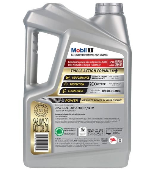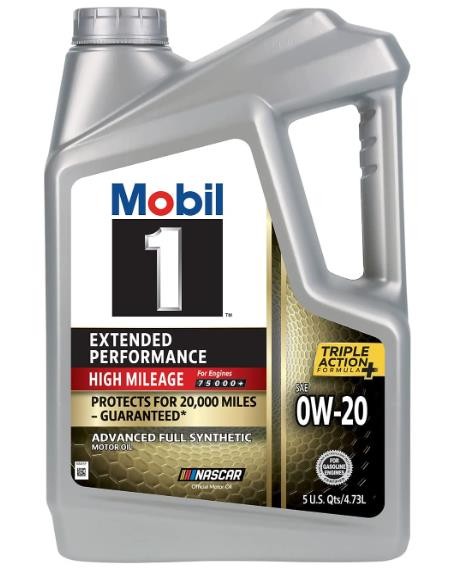 You trust your car to keep you going—even after 75,000 miles. Mobil 1 Extended Performance High Mileage full-synthetic motor oil 0W-20 gives engines with over 75,000 miles the extra care they need to go the distance. Formulated to help prevent leaks, it helps to protect critical engine parts for up to 20,000 miles between oil changes—guaranteed.* Mobil 1 Extended Performance utilizes Mobil 1’s Triple Action+ Formula to combine outstanding engine performance, protection, and cleanliness with the added benefit of maximized engine power. Specialty components in synthetic oil reduce friction, helping to prevent and remove sludge buildup in just one oil change. This technologically advanced formulation provides 20X better** internal engine heat protection than industry standards (up to 500 degrees Fahrenheit) as well as excellent low-temperature protection (to -40 degrees Fahrenheit)—bringing quick cold-weather starting and ultra-fast protection to your engine. Mobil 1 Extended Performance meets ILSAC GF-6 standards to help provide low-speed pre-ignition (LSPI) and timing chain wear protection while keeping your engine clean and helping to improve your fuel economy. Available in 1-qt. and 5-qt. bottles, Mobil 1 Extended Performance full-synthetic motor oil 0W-20 also helps control oxidation to prevent oil breakdown. This cutting-edge formula is recommended by ExxonMobil for all types of modern vehicles, including high-performance, turbo-charged, and supercharged gasoline and diesel multi-valve fuel-injected engines found in passenger cars, SUVs, light vans, and light trucks. Mobil 1 is America’s #1 synthetic motor oil brand at retail,*** trusted and recommended by car builders and experienced mechanics, and is the Official Motor Oil of NASCAR(R). (*Protects for up to 20,000 miles or 1 year, whichever comes first. To learn more about the Mobil 1 Limited Warranty, visit Mobil.US. **Based on Seq IIIH vs industry limits. ***Source: The NPD Group/ Retail Tracking Service/ Dollar Sales/ PCMO full-synthetic/ 52 weeks ending Aug 28, 2021)