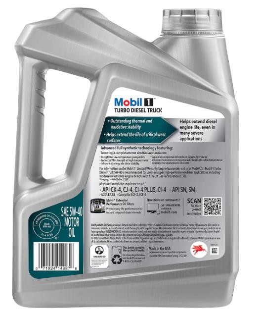 Mobil 1 Turbo Diesel Truck 5W-40 Is A Full Synthetic Heavy-Duty Diesel Motor Oil That Helps To Extend Engine Life While Providing Long Drain Capability And Potential Fuel Economy Benefits For Modern Diesel Engines Operating In Severe Applications. Utilizes State-Of-The-Art Technology To Help Deliver Exceptional Performance And Is Recommended For Use In All Super High-Performance Diesel Applications, Including Modern Low Emission Engine Designs With Exhaust Gas Recirculation (Egr), As Well As Refrigerated Units And Well-Maintained Engines. This Formula Provides Thermal And Oxidative Stability To Help Prevent High-Temperature Deposits And Low-Temperature Sludge Buildup. Its Exceptional Low-Temperature Pumpability Allows For Easy Engine Start-Up And Helps To Reduce Wear. Mobil 1 Turbo Diesel Truck 5W-40 Is Recommended For Use In A Wide Range Of Light-Duty Applications Such As Turbo Diesel Pick-Up Trucks, As Well As Heavy-Duty Applications And Operating Environments Found In The On-Road Transport And Off-Road Mining, Construction, And Agricultural Industries. The Performance Of Mobil 1 Turbo Diesel Truck 5W-40 Is The Result Of Extensive Cooperative Development Work With Major Equipment Builders And The Application Of The Latest Lubrication Technology.