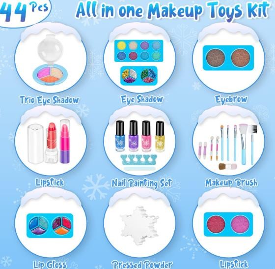 【Frozen Theme Kids Makeup Kit for Girls】: More color matching, more nail painting tools, 45 Pcs multi-functional makeup toys including Eye Shadow Color x 8, Gloss Eye Shadow Color x 6, Eyebrow x 2, Blush Color x 2, Trio Blush x 1, Lip Gloss Color x 6, Lipstick x 2(Includes 3 Colors), Makeup Brush x 10, Powder Puff x 1, Nail Polish x 4, Nail File x 1, Toe Separator x 1, Makeup Box with Mirror x 1. Girls with makeup will be more beautiful and more confident.