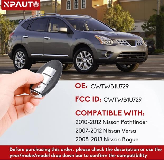 ?【Fit for Vehicles】:This key fob transmitter replacement for Nissan Rogue 2008 2009 2010 2011 2012 2013 / Pathfinder 2010-2012 / Versa 2007-2012【NOTE】Before purchasing this order, please check the description or use the year/make/model drop down bar to confirm the compatibility