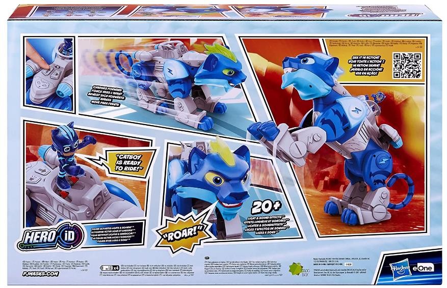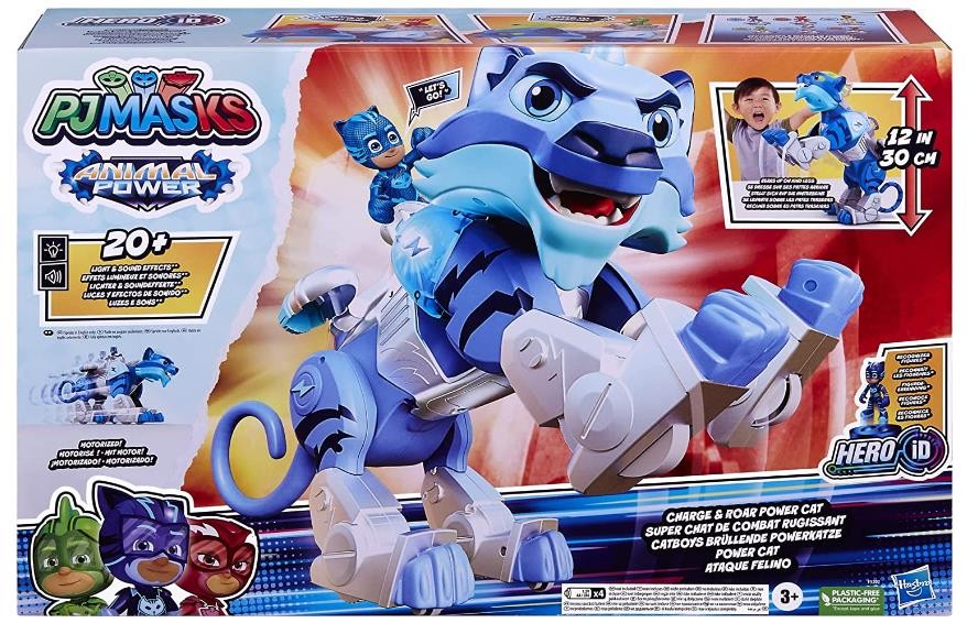 The PJ Masks Animal Power Charge and Roar Power Cat is ready to speed into action! Inspired by the show, this motorized Cat Stripe King toy has wheels on his feet; press the buttons on his back to see his head and shoulders light up, hear awesome battle-ready roaring sounds, and see him charge forward and rear up on his hind legs to a height of 12 inches! Press the motion button once, twice, or simultaneously with the lights and sounds button to activate different sets of charging actions for lots of exciting play. This interactive toy is equipped with amazing Hasbro Hero ID technology, which recognizes Hero ID-compatible 3-inch superhero action figures as heroes or villains and even activates some character-specific lights, sounds, and phrases! (Catboy figure included. Other figures sold separately. Subject to availability.) Kids can place the Catboy figure in the saddle and imagine him riding to the rescue! These preschool toys for boys and girls make great gifts for kids who love superhero adventures. Add these super hero toys for 3 year old boy or girls to your collection. Hasbro and all related terms are trademarks of Hasbro.