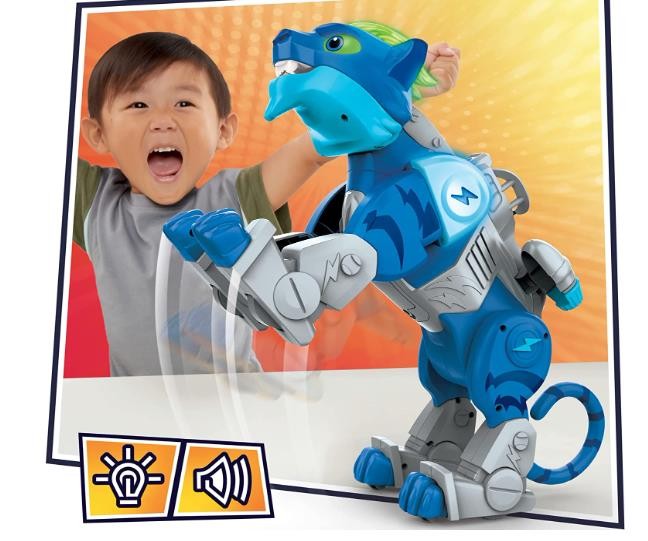 • MOTORIZED REARING AND CHARGING ACTION: Press the motion button on his back to activate lights and roaring sounds and see him rear up on his hind legs and charge forward!