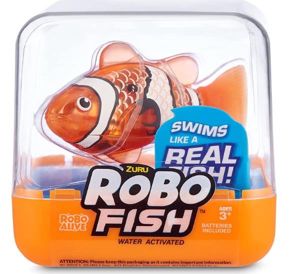 The new ZURU Robo Fish by Robo Alive are the most iconic real- life robotic swimming pets ever! Drop them in water and watch them swim in 5 different directions and dive up to 6ft as Robo Fish’s water activated technology bring these fish to life like magic! There are 6 colors to collect, and they even have water activated color change! Watch their scales change color before your eyes, then pull your fish out of the water, gently pressing your palm onto their scales and they change back to their original color. These realistic fish make for the perfect pet or prank toy!