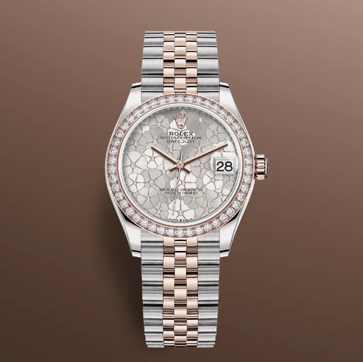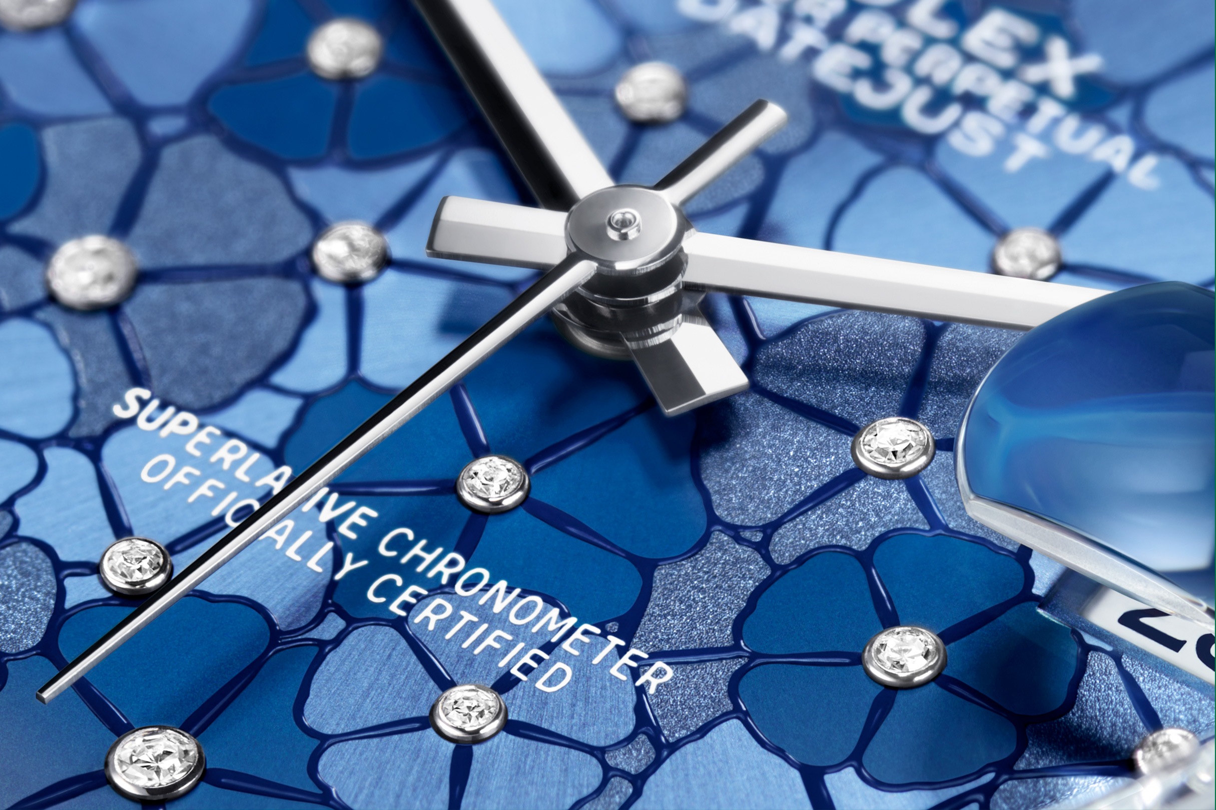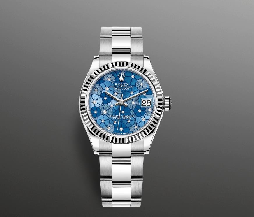 THIS OYSTER PERPETUAL DATEJUST 31 IN OYSTERSTEEL AND WHITE GOLD FEATURES AN AZZURRO-BLUE FLORAL-MOTIF, DIAMOND-SET DIAL AND AN OYSTER BRACELET.