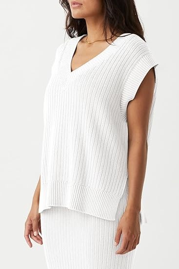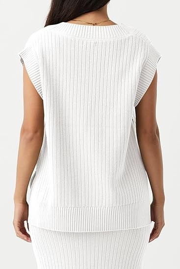 Features - Knitted sweater tank tops feature with deep v neck, ribbed hem, side split, oversized loose fit, plain solid color, 2024 trendy casual pullover sweater vests, short cap sleeve sweater for women