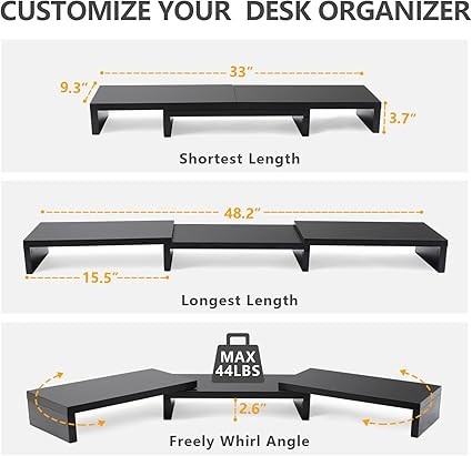 CUSTOMIZE YOUR OWN DESK ORGANIZER: Our desk monitor stand has adjustable length (33-48.2 inch) and angle, especially, the ability to change the angles of the end pieces. The desktop monitor stand can easily be moved adjusted to suit the curve of your monitors and fit smaller or larger desks!