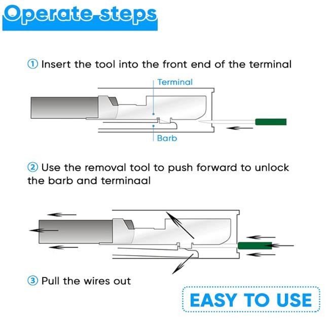 • 【Easy to Use】The terminal pin removal tool is easy to use, just push and pull the terminal pins with connector removal tool for removal effortlessly from the wire harness connectors without any damage. Kindly Note: Most of the wire harnesses are held in place with barb clips. You can use a tool to lift or flatten the barbs, and then gently pull out the wire ends. Pay special attention to strength and direction.