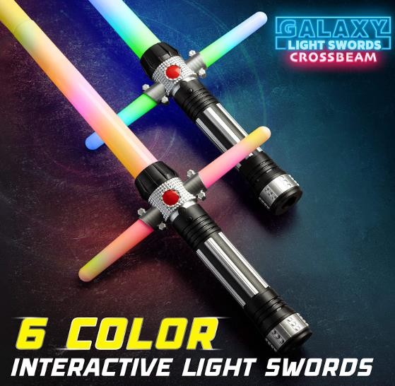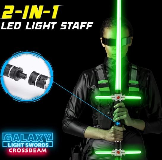 • 2 IN 1 LED LIGHT UP SABER SWORDS: Harness the power of the Force with these glow in the dark light sabers with bright color-changing LEDs and FX sound; these expandable and retractable light swords easily connect together to create 1 double-edged mega led lightsaber sword for epic galactic battles