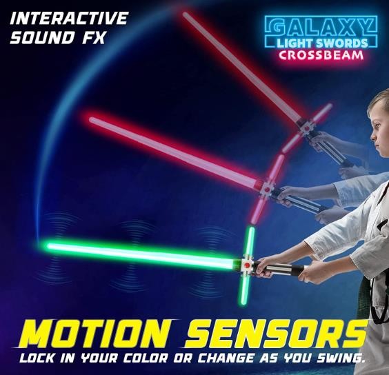 • MOTION-SENSITIVE COLOR CHANGING LEDS: Fight in a galactic war with family and friends and watch the vibrant LEDs change colors between yellow, red, blue, green, purple, and white every time you cross swords or lock in the color of your choice